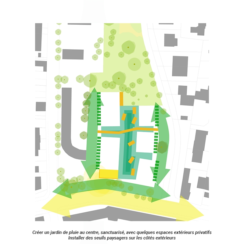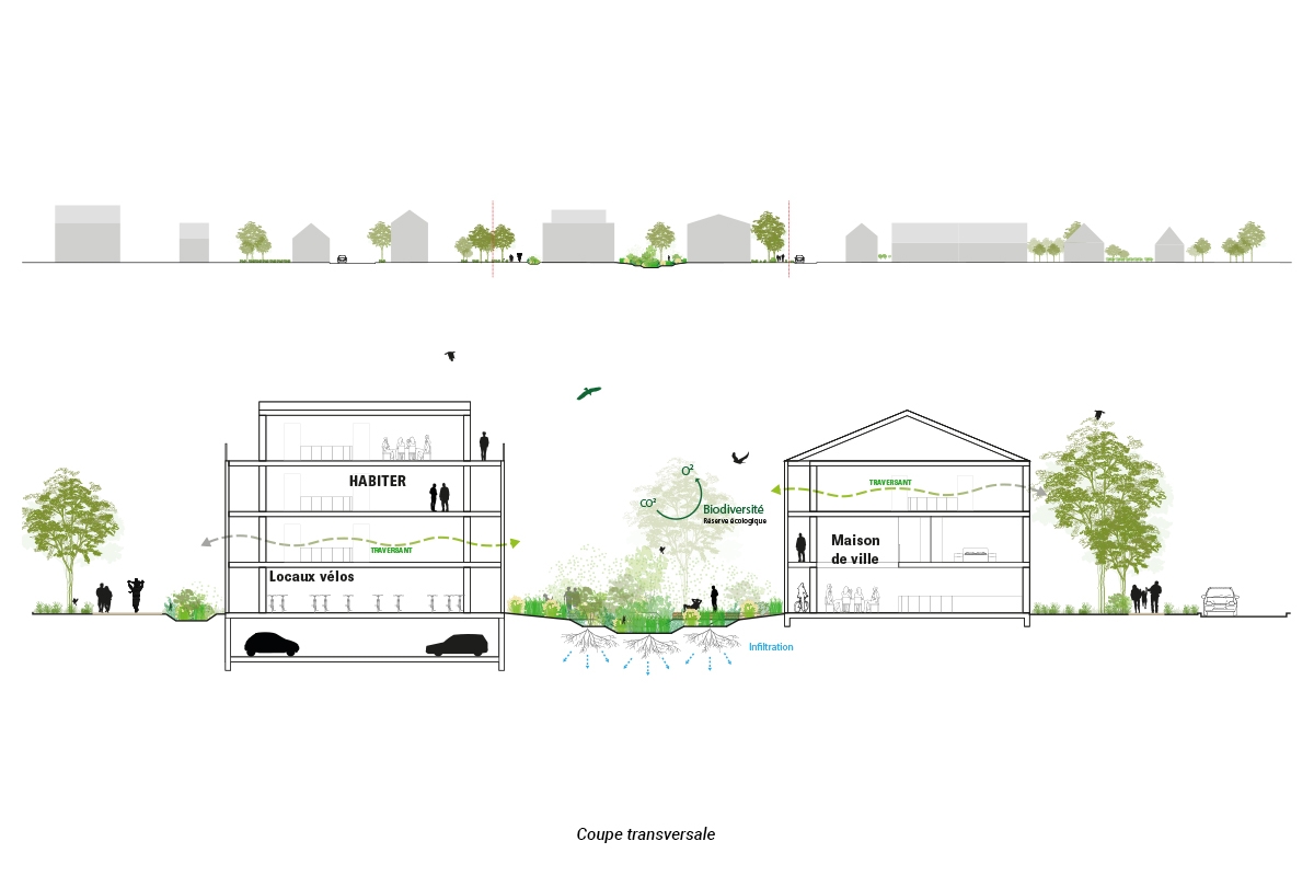 Au cœur du projet, dans la continuité du parc, un espace sanctuarisé pour la biodiversité prend place. Aménagé et paysagé comme un jardin de pluie, cette réserve naturelle permet de gérer les eaux pluviales à ciel ouvert et s’offre à la vue de l’ensemble des logements.