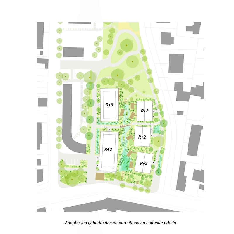 Les 5 petits immeubles proposés sont construits en bois et isolés en paille. Leur structure poteaux-poutres permet une grande flexibilité dans la configuration des logements, et une adaptabilité aux transformations futures. Ces dispositions permettent de viser le niveau RE 2028.