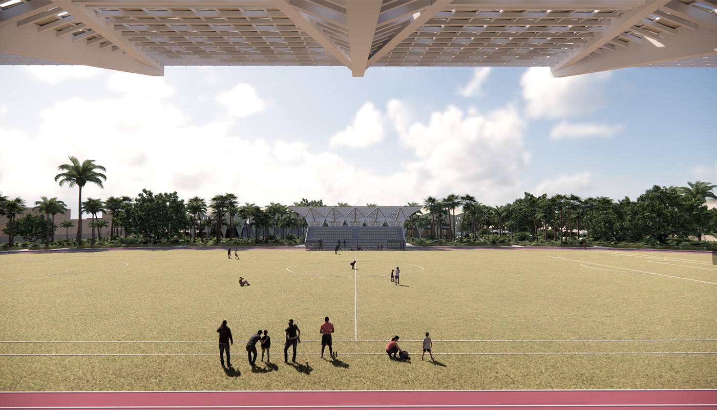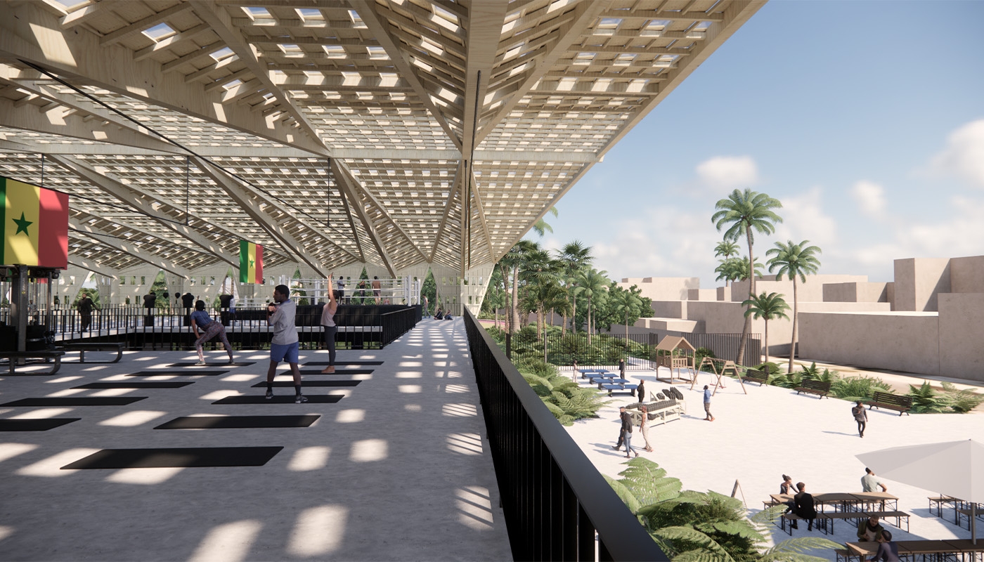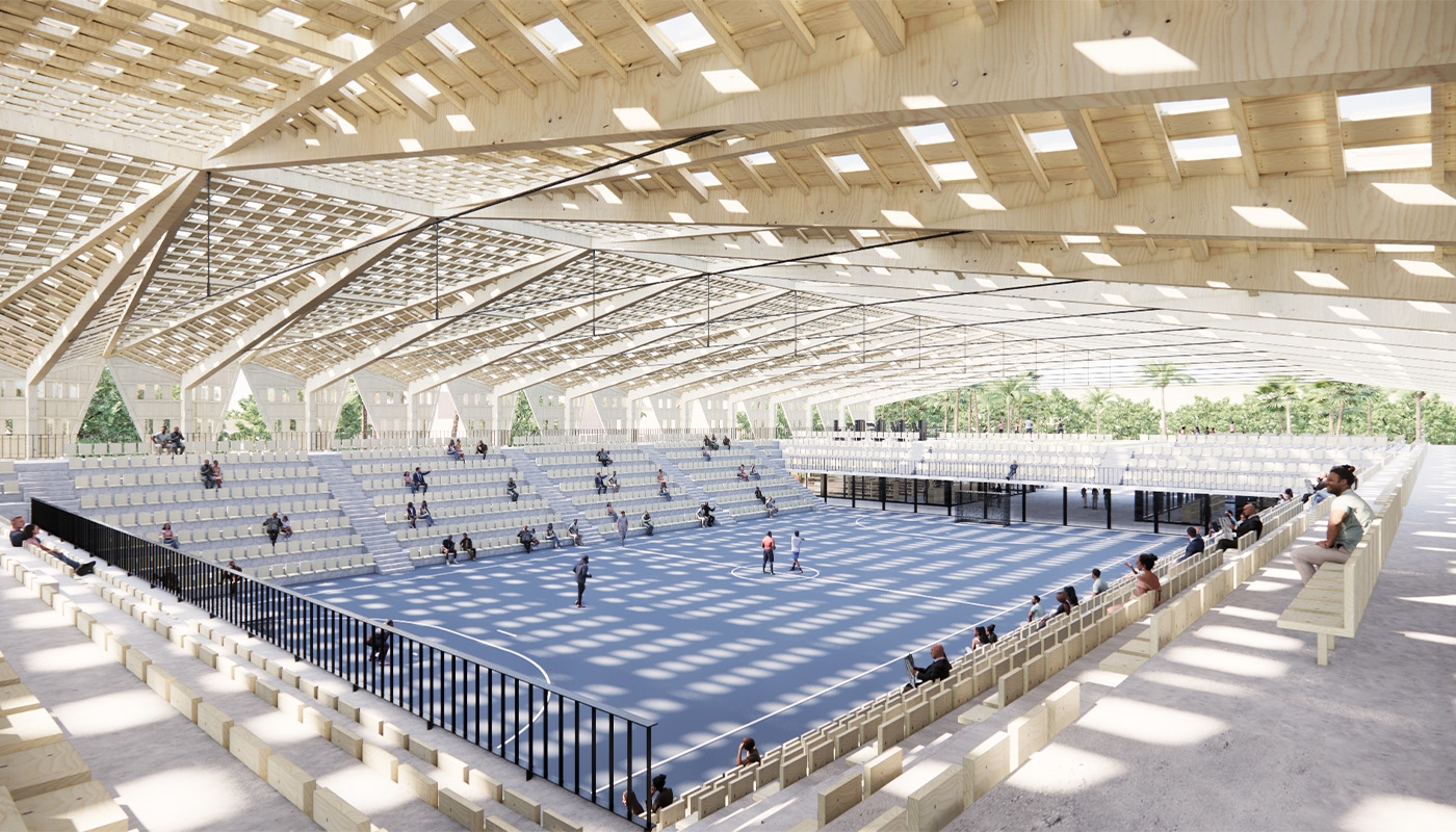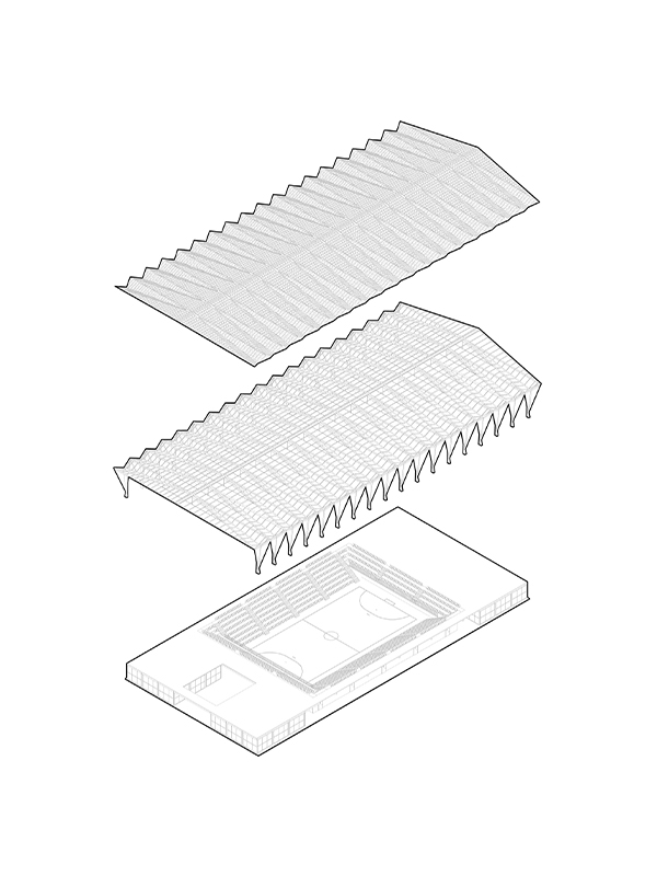 Cette toiture plissée protège de la pluie et du soleil, tout en laissant passer la lumière naturelle par une multitude de petites ouvertures à la manière d’une canopée. Le principe du portique a été conçu pour être préfabriqué et dupliqué. Ainsi, la halle est adaptable dans sa longueur afin de pouvoir répondre aux types et à la quantité de programmes développés en dessous.