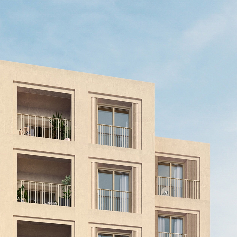 En adéquation avec les immeubles voisins construits en béton, le projet propose de poursuivre le vocabulaire minéral de la rue, en développant une écriture sobre et élégante utilisant ce même matériau dominant : le béton, que nous souhaitons traiter par teinte (colorant ou agrégats) et sablage afin que sa texture soit assimilable à celle de la pierre.
