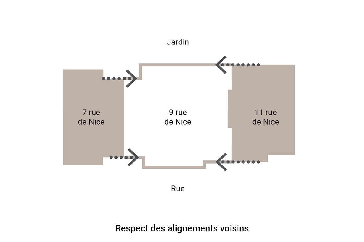Une saillie au centre de la façade sur rue vient permettre de rattraper les deux alignements différents des façades limitrophes. Cette variation au centre de la façade créée par la même occasion une ponctuation qui s’intègre au front existant et spécifique de la rue de Nice : une façade urbaine et domestique, séquencée par des implantations et des hauteurs d’immeubles variées, et rythmée par divers dispositifs architecturaux : balcons, coursives, fûts d’escaliers en saillies ou encore toitures mansardées.