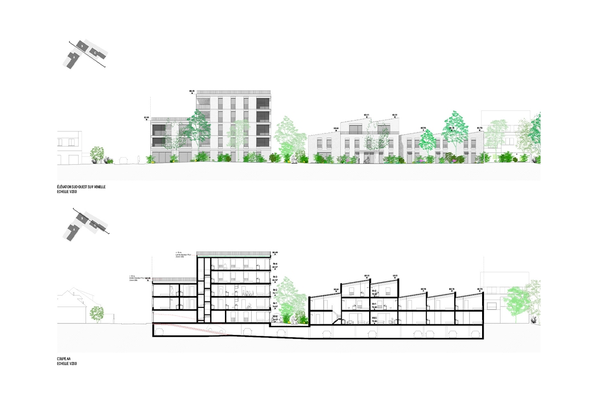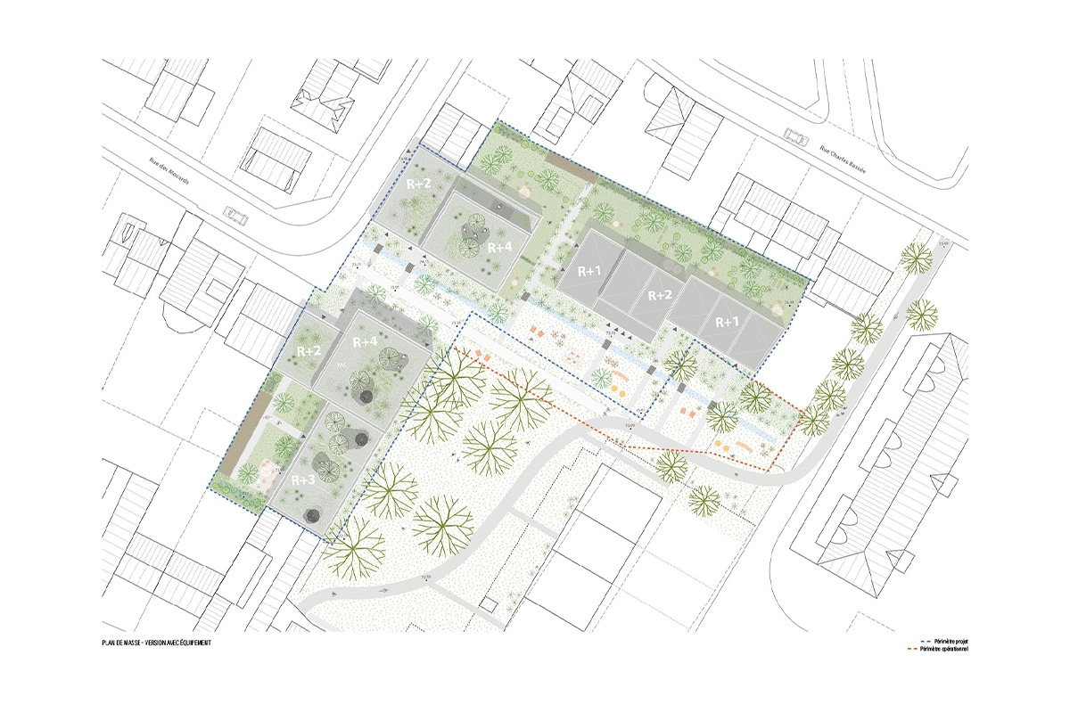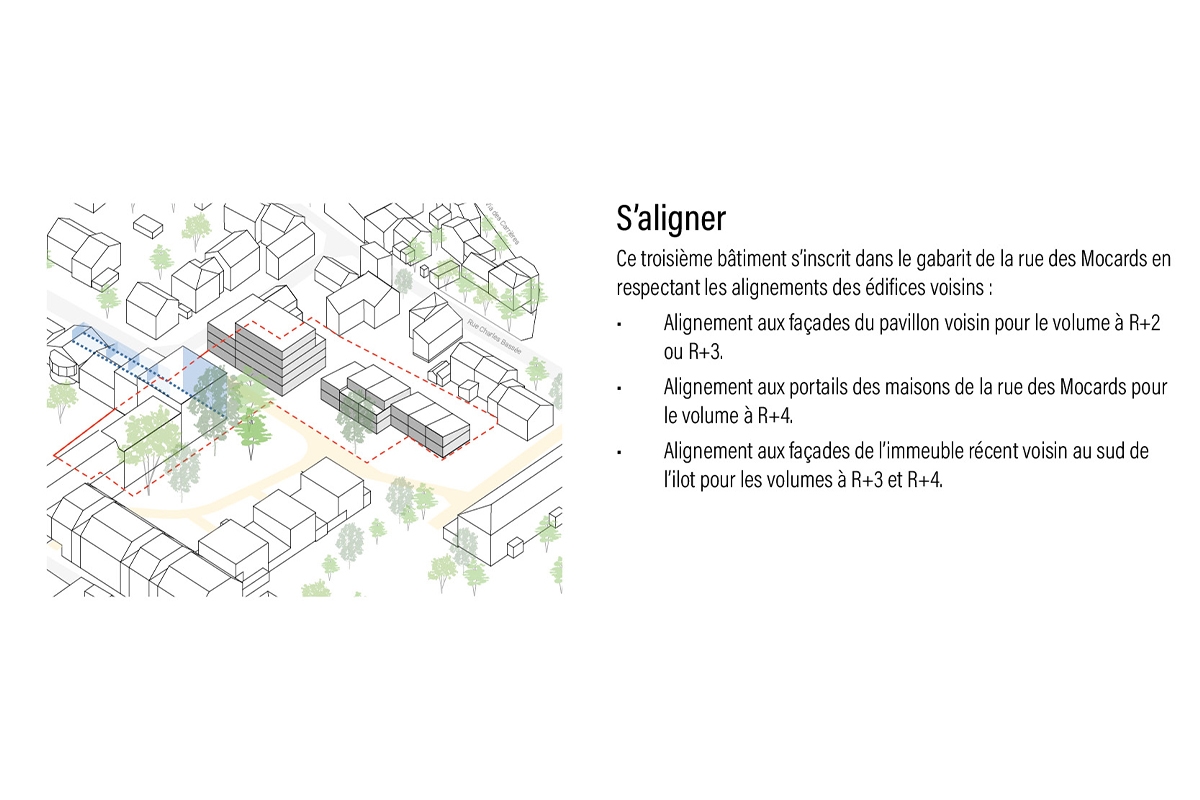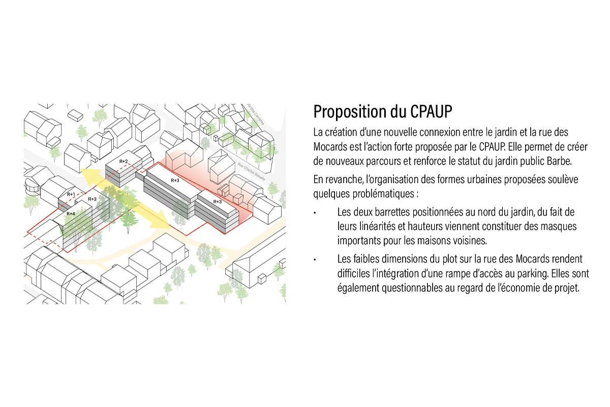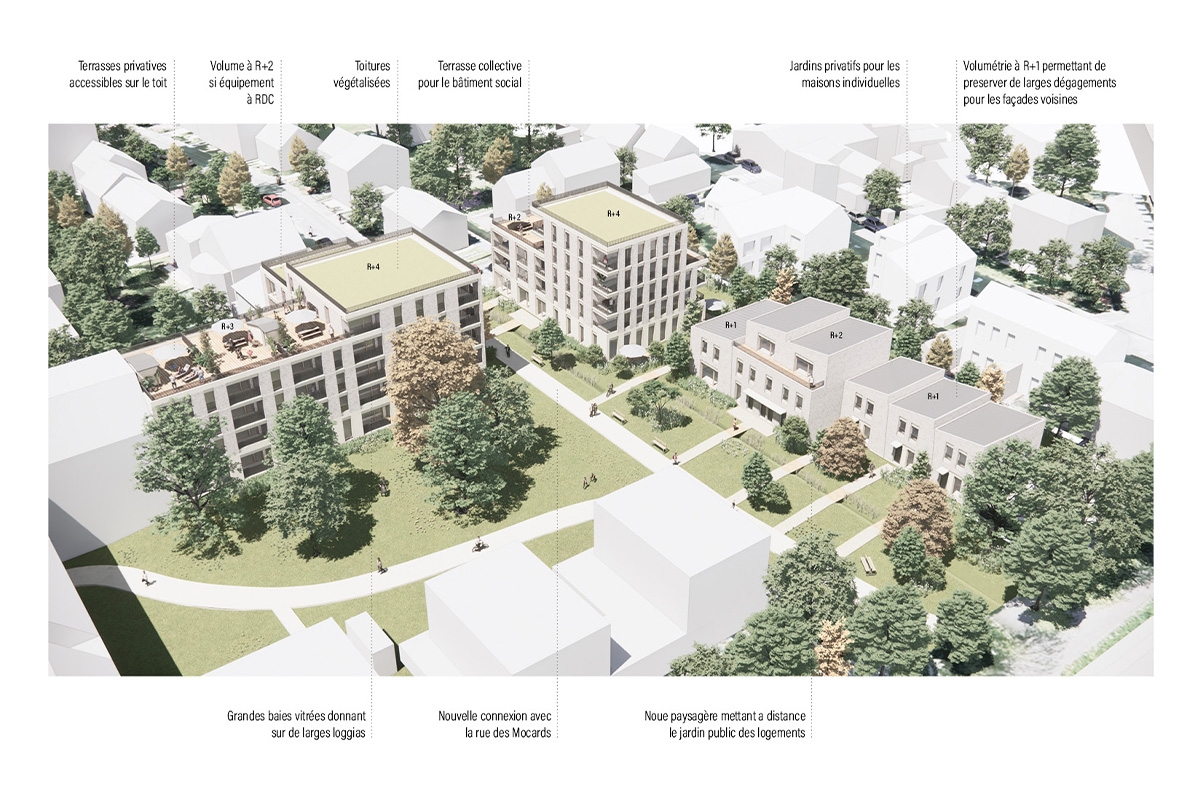 Le projet ouvre une nouvelle traversée publique entre la rue des Mocards et le jardin Barbe, préserve le groupe d’arbres remarquable et compose trois volumes (R+1 à R+4) complétés par des maisons en bande, pour une insertion mesurée dans le voisinage. De plus, le parking mutualisé en sous-sol et la rétrocession d’espaces piétons renforcent l’ouverture du site sur la ville.