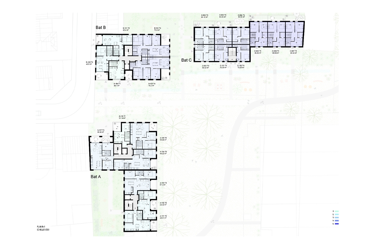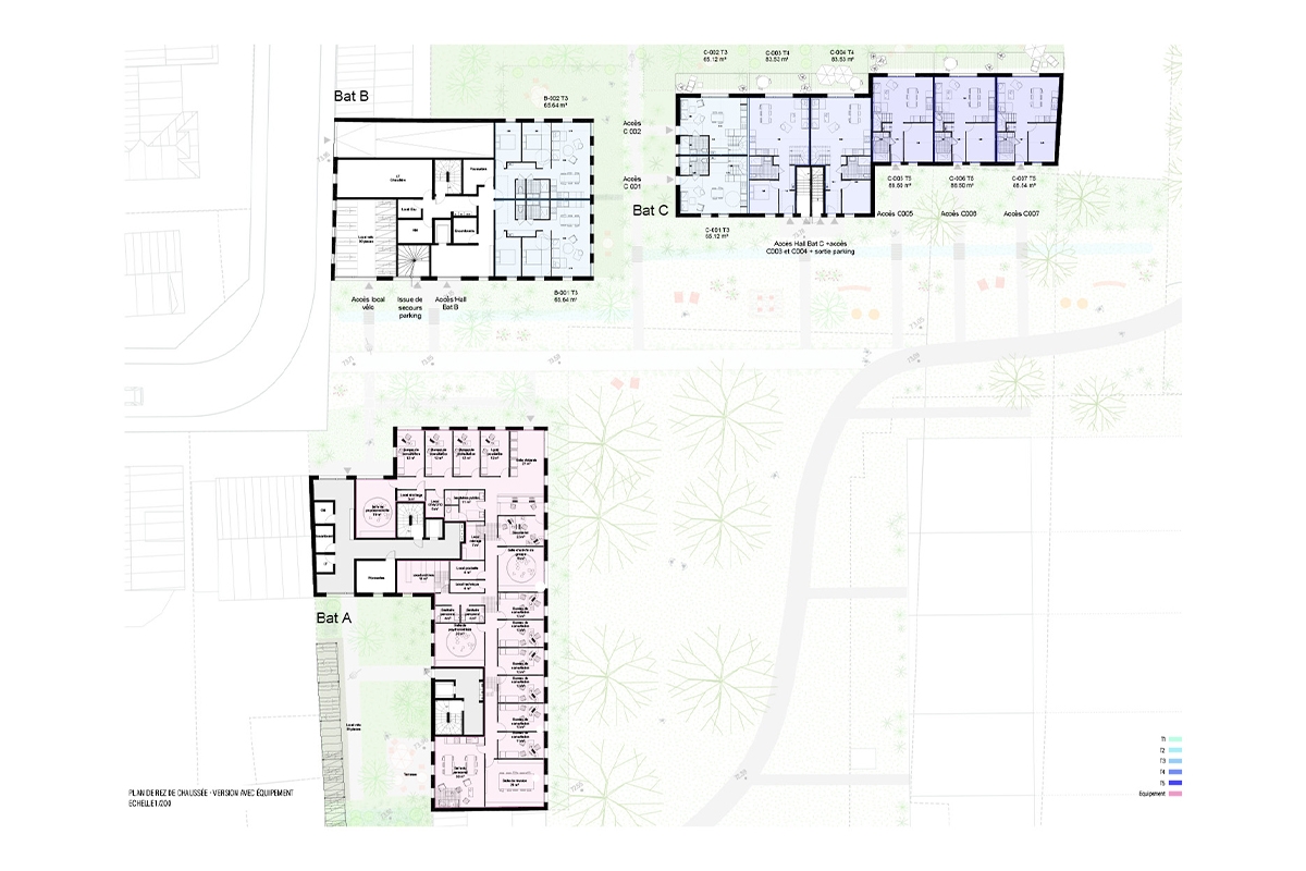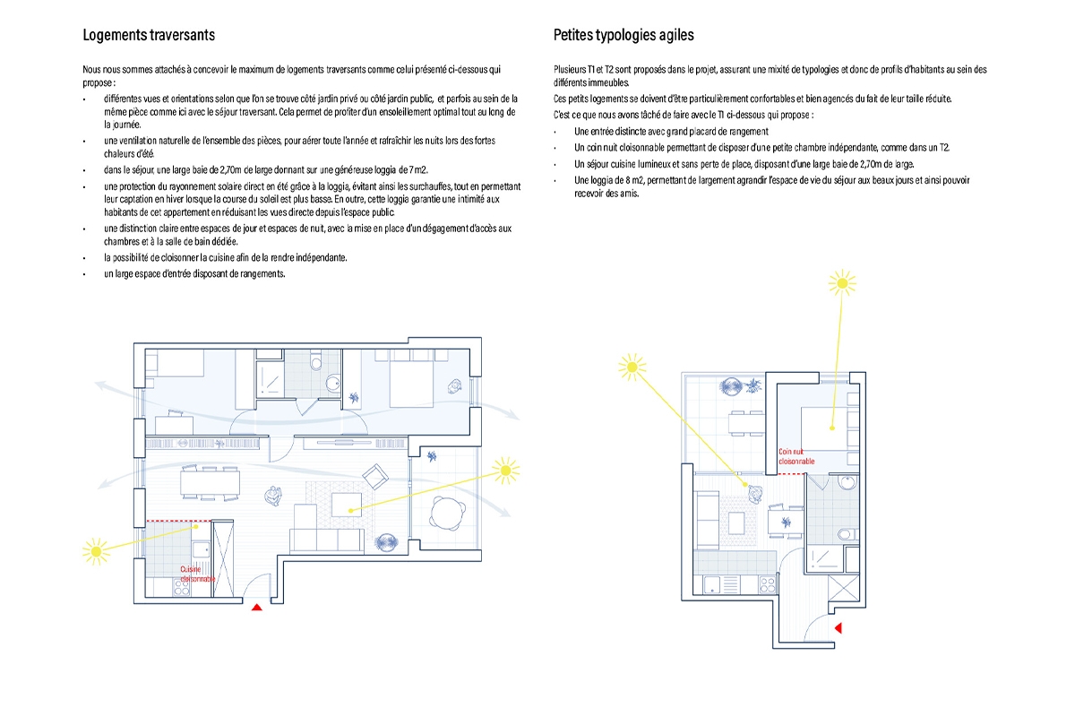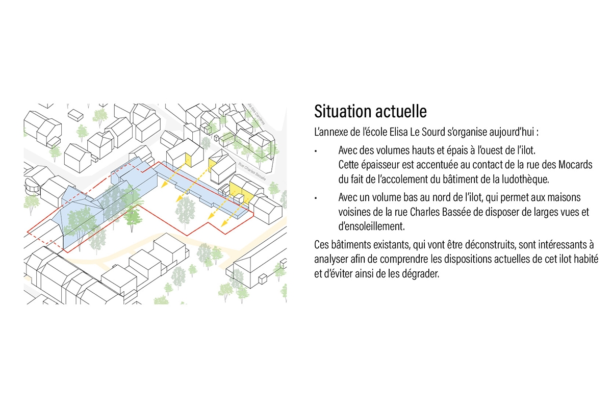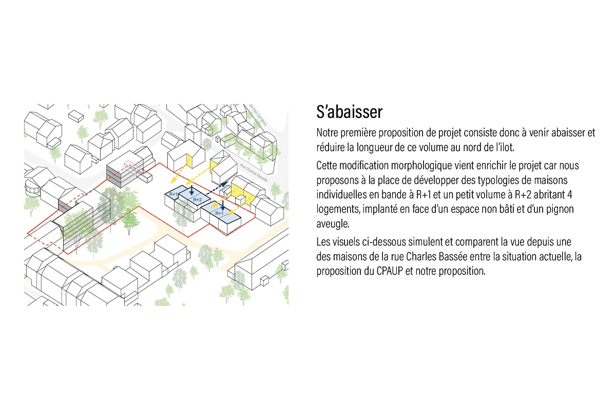 Le projet ouvre une nouvelle traversée publique entre la rue des Mocards et le jardin Barbe, préserve le groupe d’arbres remarquable et compose trois volumes (R+1 à R+4) complétés par des maisons en bande, pour une insertion mesurée dans le voisinage. De plus, le parking mutualisé en sous-sol et la rétrocession d’espaces piétons renforcent l’ouverture du site sur la ville.