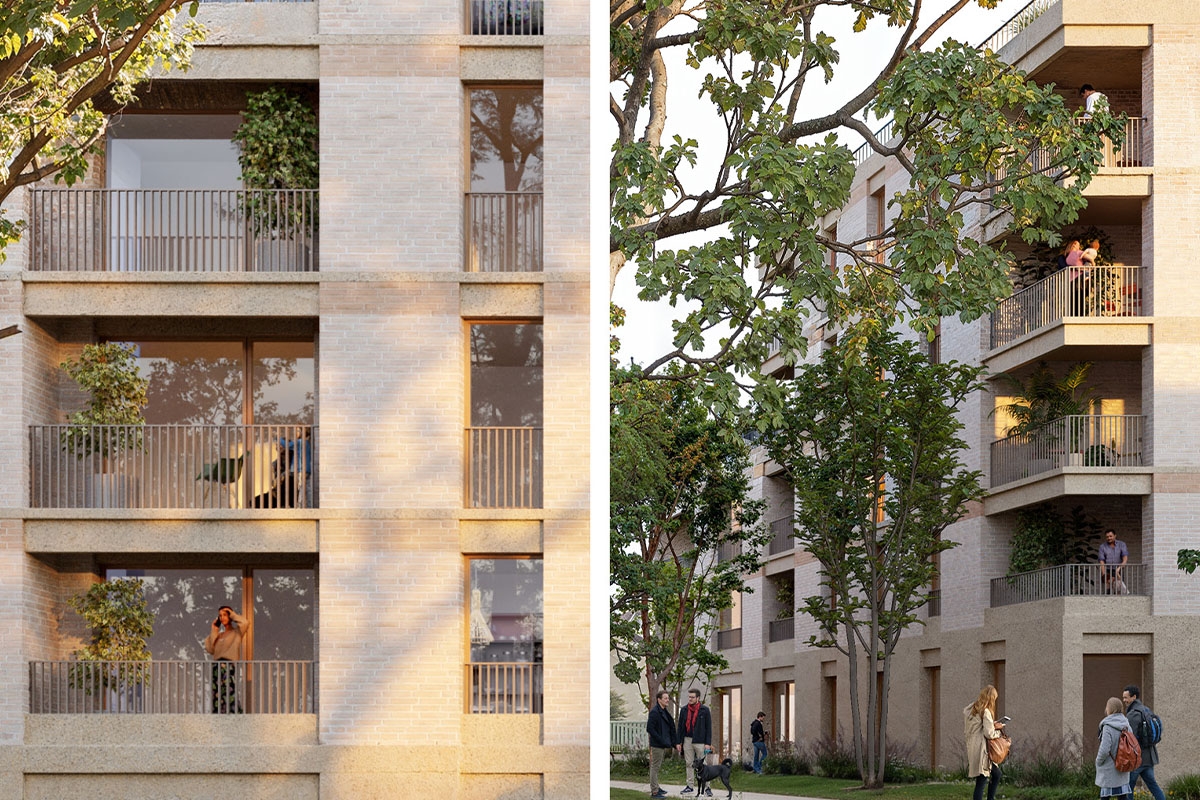 Le socle paysager maximise la pleine terre et la gestion à ciel ouvert des eaux (noues, continuités écologiques), tandis que des matériaux durables (brique, béton bas carbone, menuiseries bois) et une conception bioclimatique visent les objectifs RE2025.