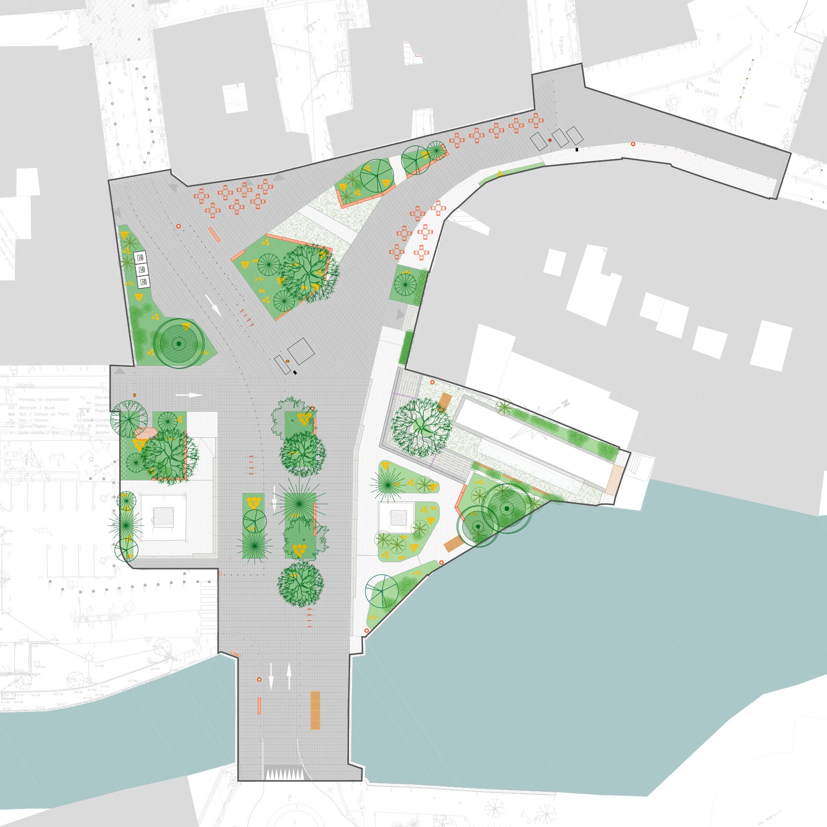 De part et d'autre du plateau, trois sous-espaces jardinés se structurent autour des monuments du Pape Gerbert, de la colonne Monthyon et du vieux lavoir. Ces espaces traités en calade mettent en avant la statuaire historique de la Place Gerbert et viennent offrir une autre échelle d'agréement aux Aurillacois, aujourd'hui demandeurs d'espaces de pause et de détente. Le lien à l'eau de la Jordanne est facilité avec l'insertion d'un emmarchement qui désenclave le lavoir et facilite sa redécouverte.