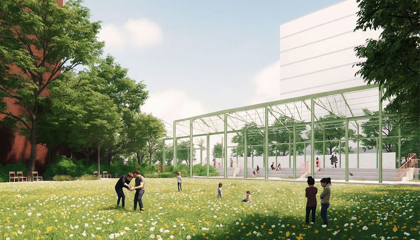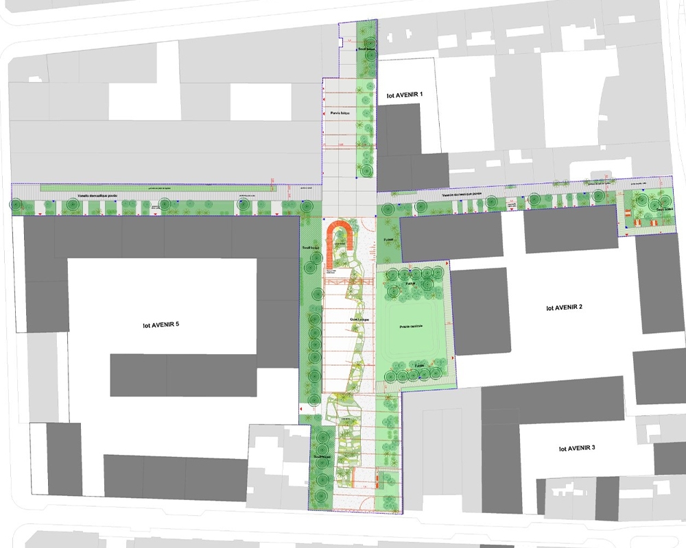 La conservation des grands îlots industriels, qui étaient d’anciennes propriétés privées dont les sous-sols sont dépourvus de réseaux, permet de mettre en place une véritable stratégie d’acclimatation de la ville en trouvant facilement de l’espace pour planter densément. L’îlot Avenir est donc conservé et rendu traversable par les piétons et les vélos, mais pas par les voitures.