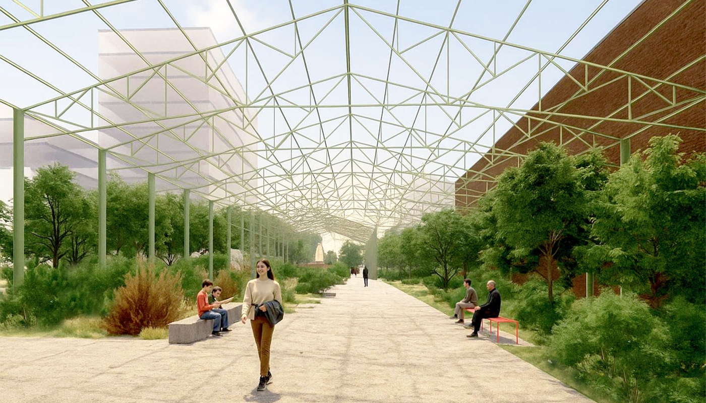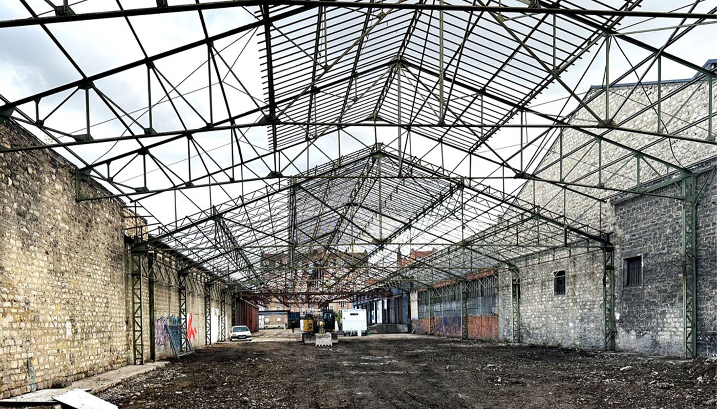 Inscrit sur les parcours du quotidien, à proximité des écoles, équipements sportifs et logements, l’Ivrynage Avenir est organisé comme une large allée piétonne aménagée sous quatre halles industrielles existantes et dont les structures sont conservées en témoin de l’histoire du site.