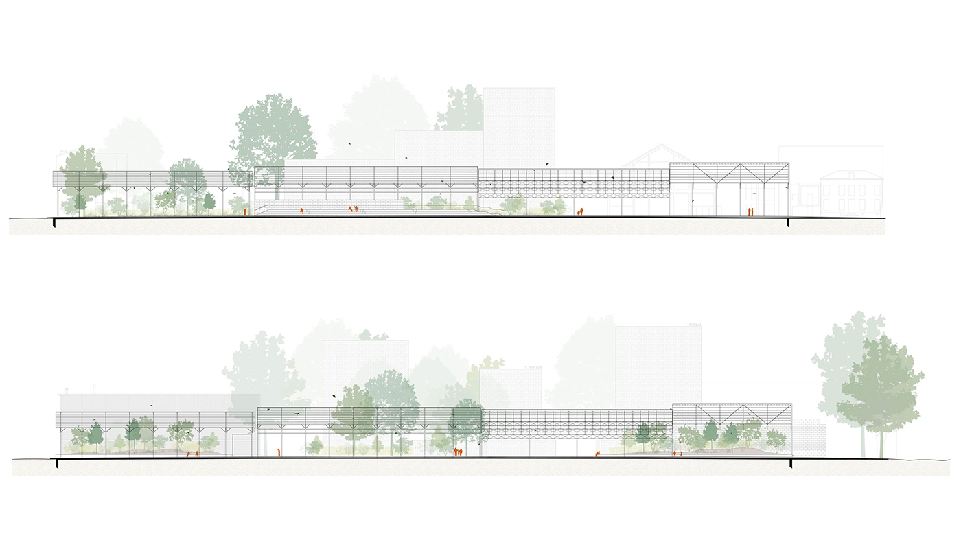 Ce cheminement nord–sud est ponctué de deux venelles perpendiculaires, d’un quai existant inséré dans un système de gradin et d’un grand jardin en pleine terre introverti en cœur d’îlot.