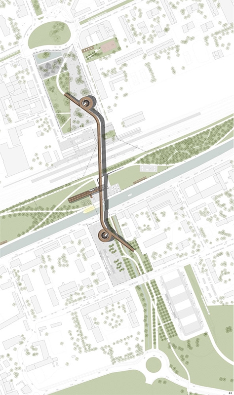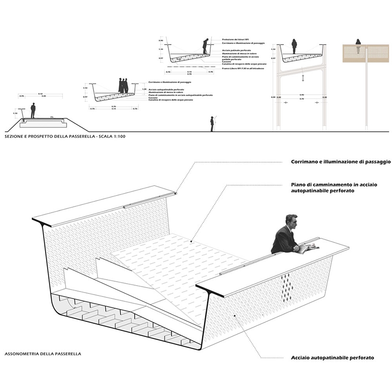 Vis-à-vis de ces multiples situations observées et traversées, des mutations à venir ainsi que de la distance importante du franchissement (400 m) ; il nous semble important de créer un lien unitaire, simple et identifiable. C’est l’unité et la simplicité formelle de l’ouvrage qui favorisera le lien urbain et permettra la mise en valeur des paysages et des situations traversées. Pour cela, nous avons imaginé une passerelle à la section transversale continue sur l’ensemble du franchissement. Celle-ci est inspirée des bateaux à fond plat du Naviglio Grande; il s’agit d’une tôle d’acier pliée et perforée qui assure une continuité de traitement matériel entre les gardes corps et la sous-face de la passerelle.