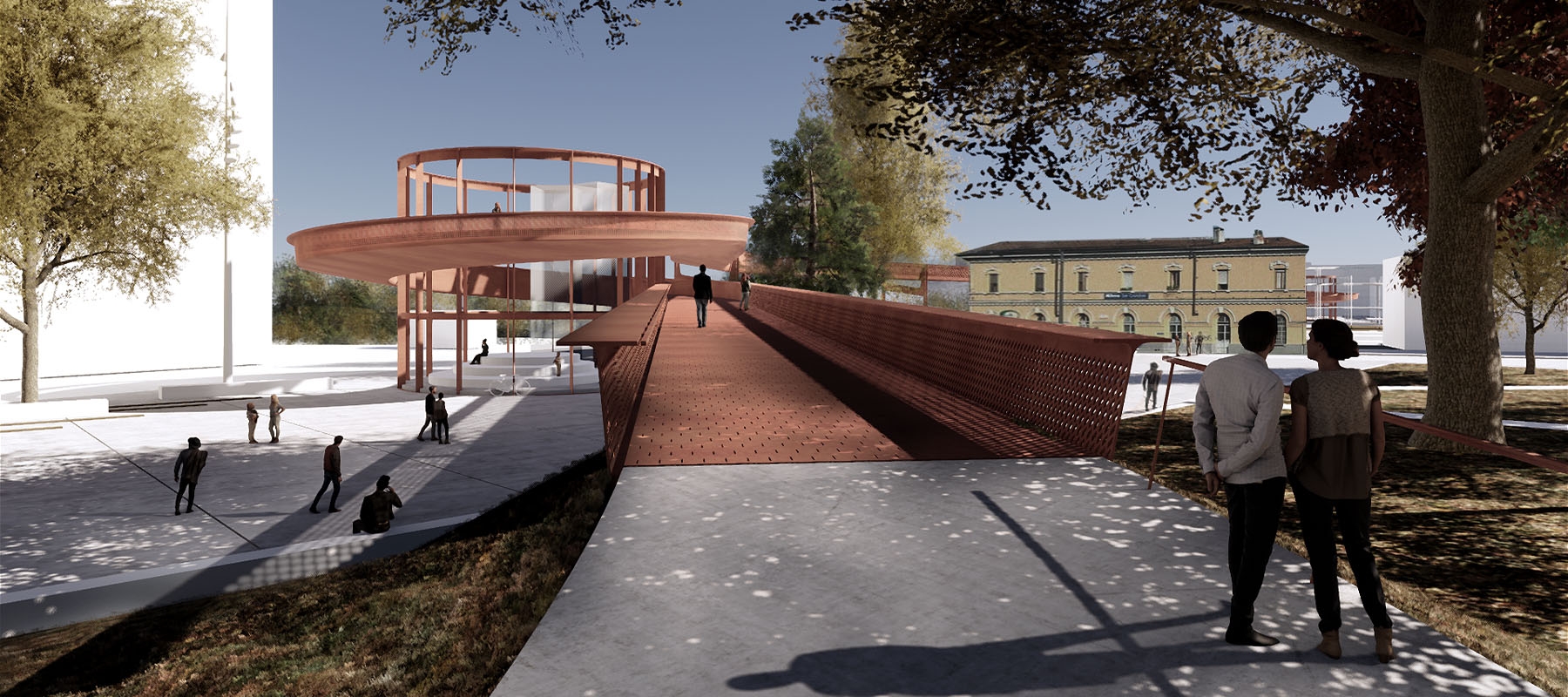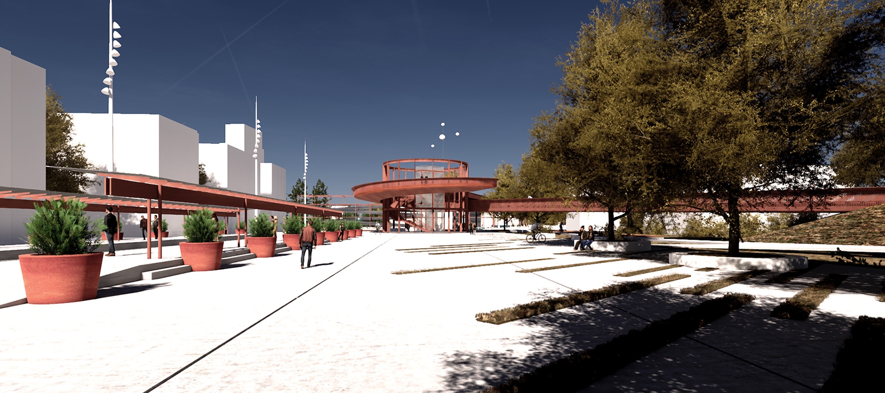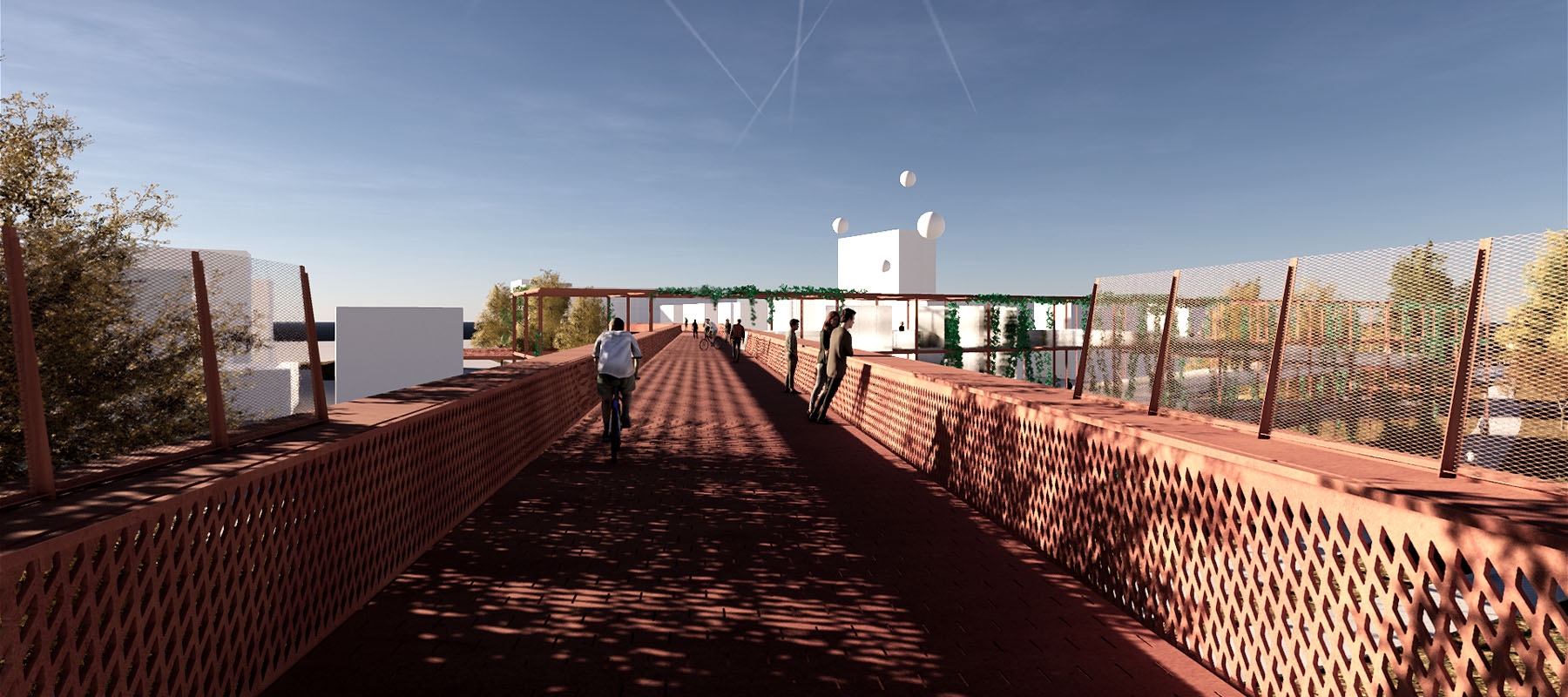 Au-delà de sa simplicité souhaitée, la passerelle n’en reste pas moins un nouvel élément qui façonnera l’identité du quartier et le sud-ouest de la métropole. Tout d’abord de par sa matérialité : l’acier auto corten, qui inscrit l’ouvrage dans la gamme colorimétrique des teintes chaudes des enduits de façades et des tuiles de toitures en terre cuite des immeubles voisins. Mais également par la création des 3 pavillons de connexions entre la passerelle et le sol ; des édifices iconiques et signalétiques marquant les accès à l’ouvrage et les connexions intermodales. Le soir, ils sont éclairés tels des signaux urbains lumineux, tout comme la passerelle qui marquera ainsi sa ligne dans le paysage.