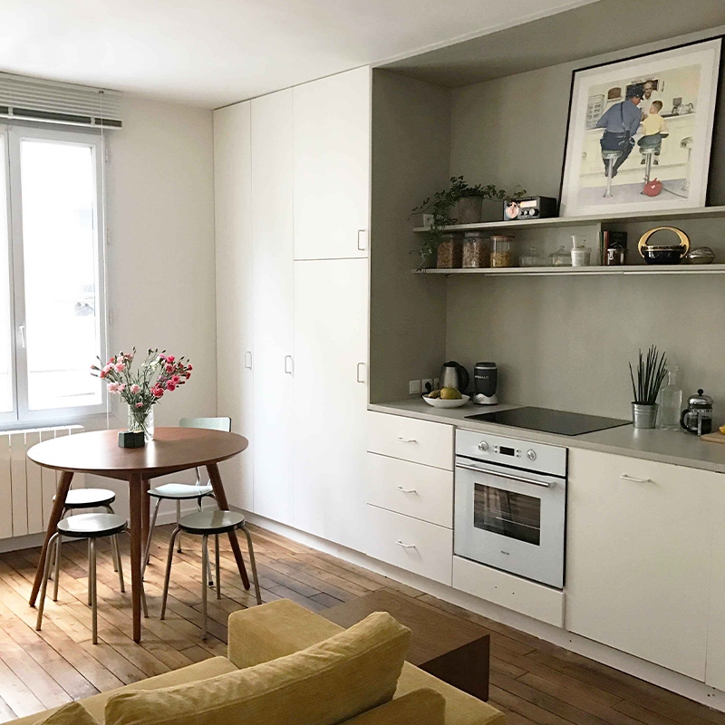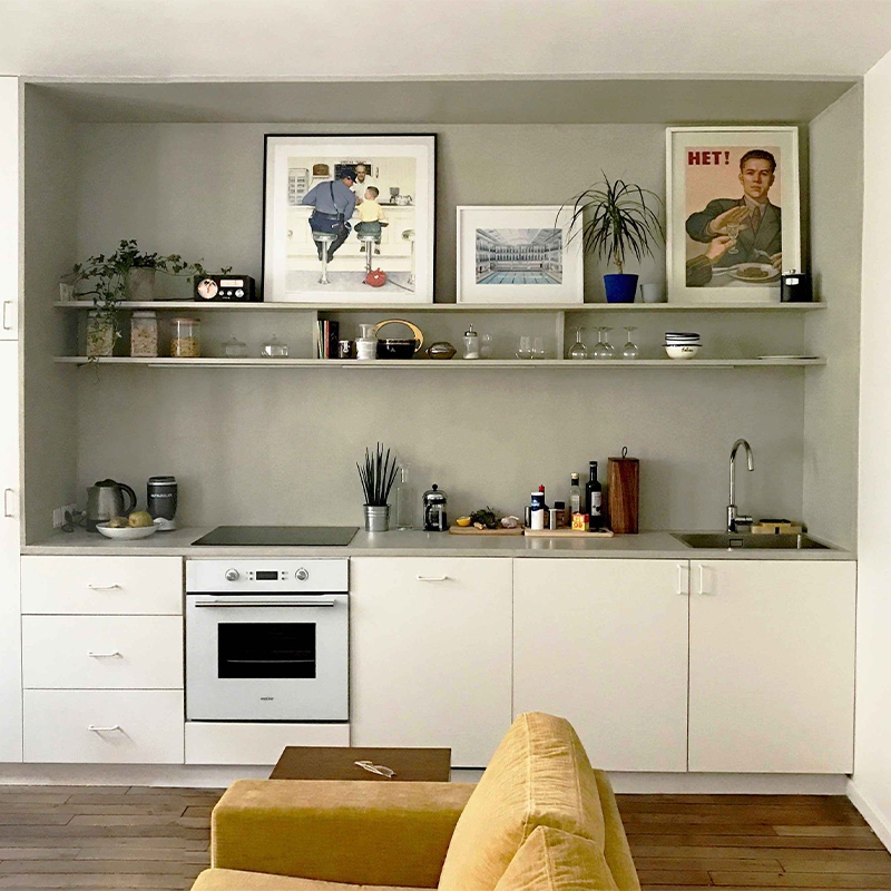 Un grand meuble en bois disposé sur l’ensemble du mur du fond de l’appartement à la fois dans le séjour et la chambre permet d’accueillir de nombreux rangements. Deux encadrements traités en béton ciré définissent l’espace cuisine d’un côté et la tête de lit dans la chambre.
