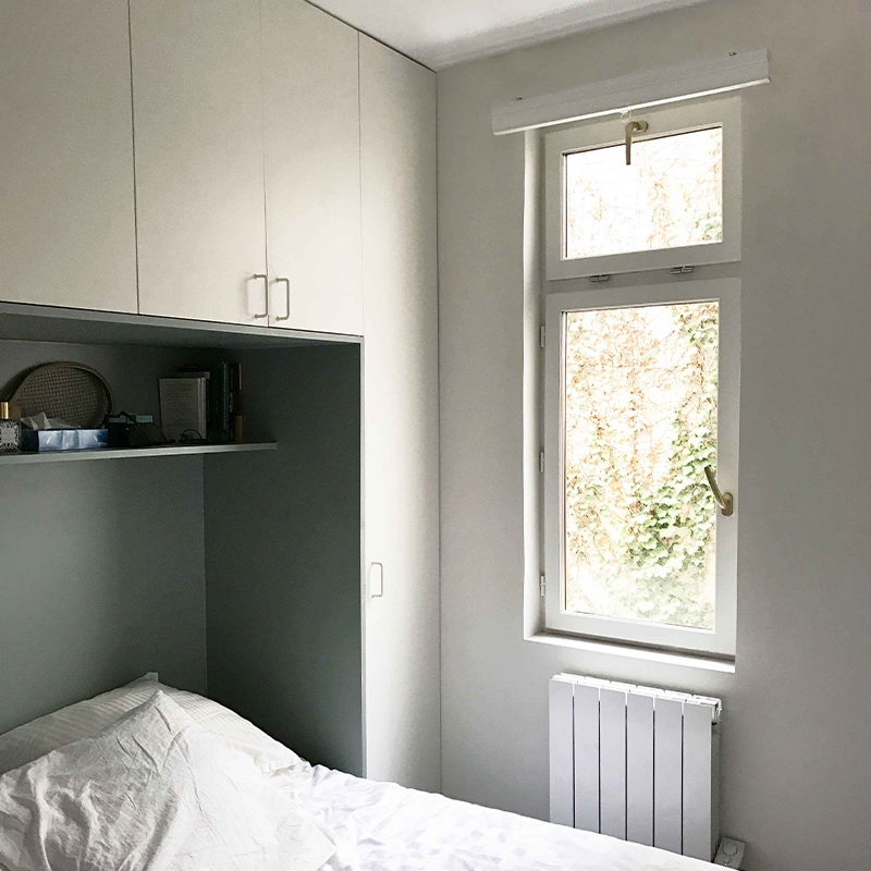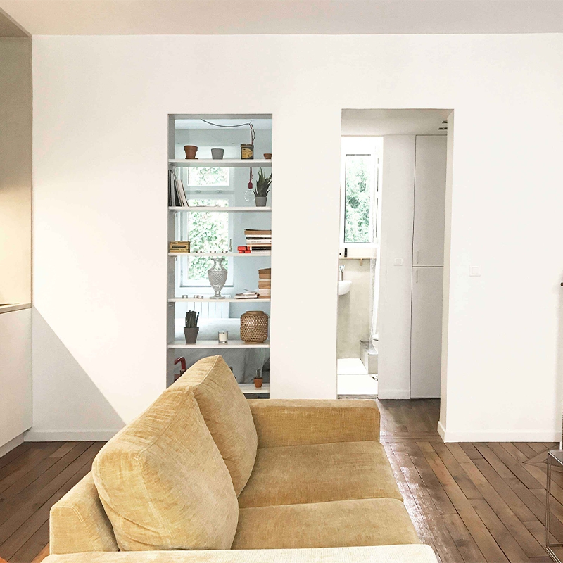 L’encadrement de porte existant entre la chambre et le séjour est conservé, mais condamné avec un vitrage et des étagères. Ainsi, la lumière et le regard passent d’une pièce à l’autre, apportant de la profondeur et des relations visuelles transversales dans l’appartement.