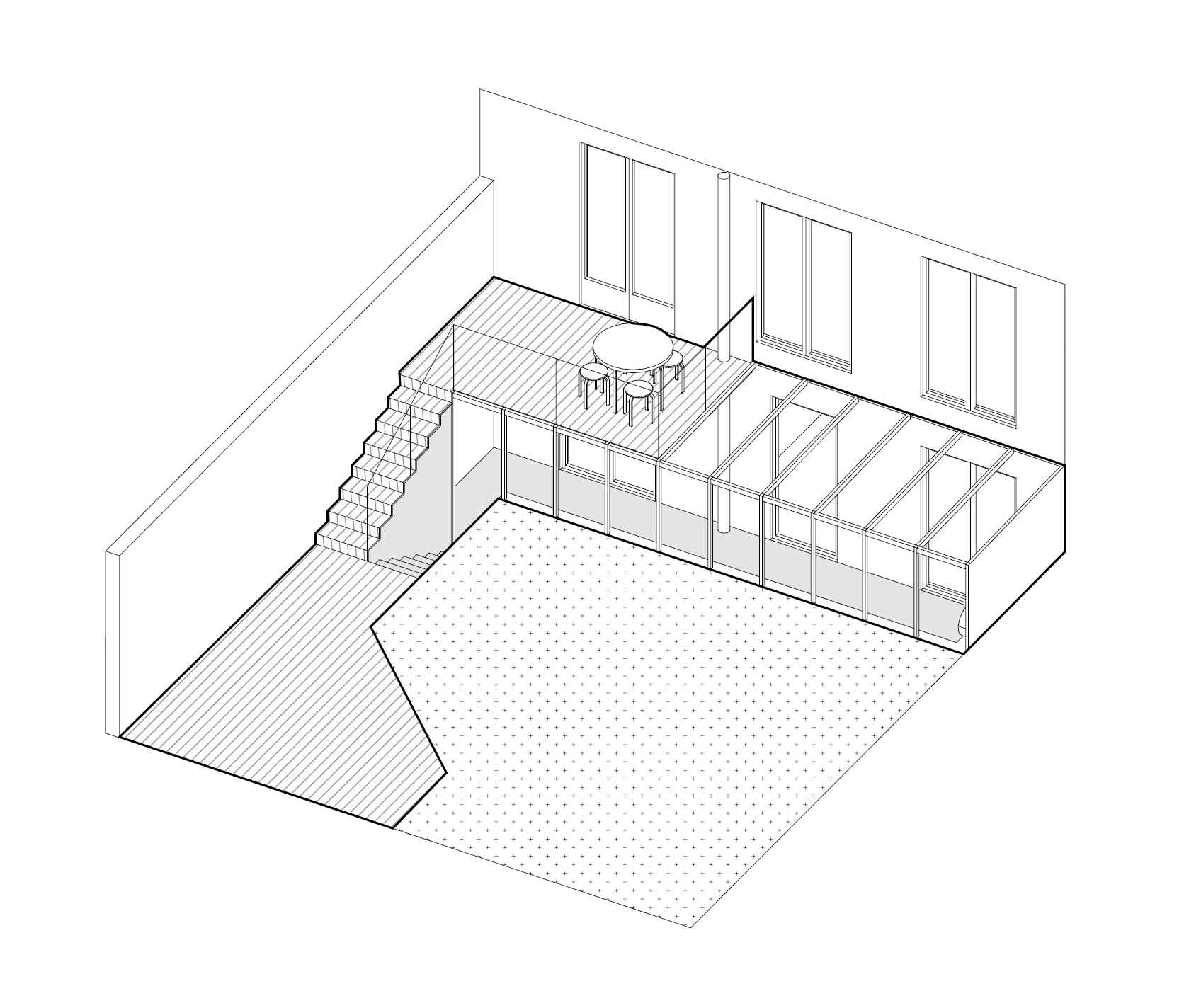 - extension du RDC bas semi enterré de la maison, une nouvelle pièce aux usages flexibles : jardin d’hiver, espace de réception, salle de sport...