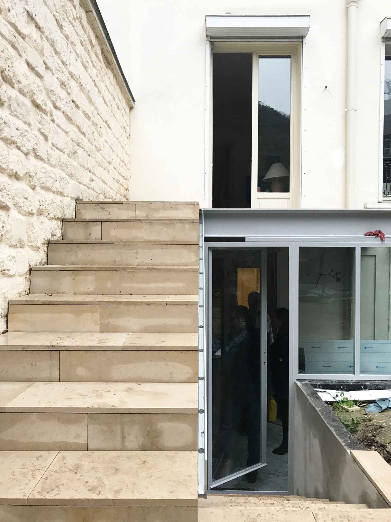 Le vocabulaire architectural et les matériaux utilisés s’inscrivent dans un registre parisien. La verrière est en acier gris, les enduits de couleur crème et le revêtement de sol est en pierre de Bourgogne.
