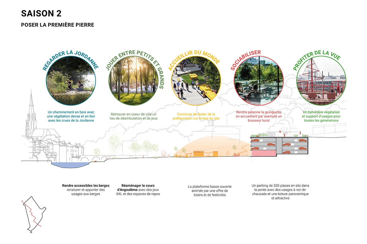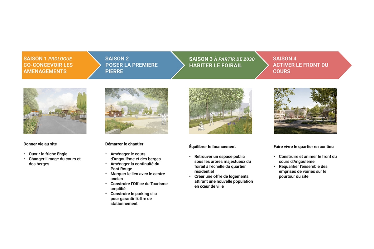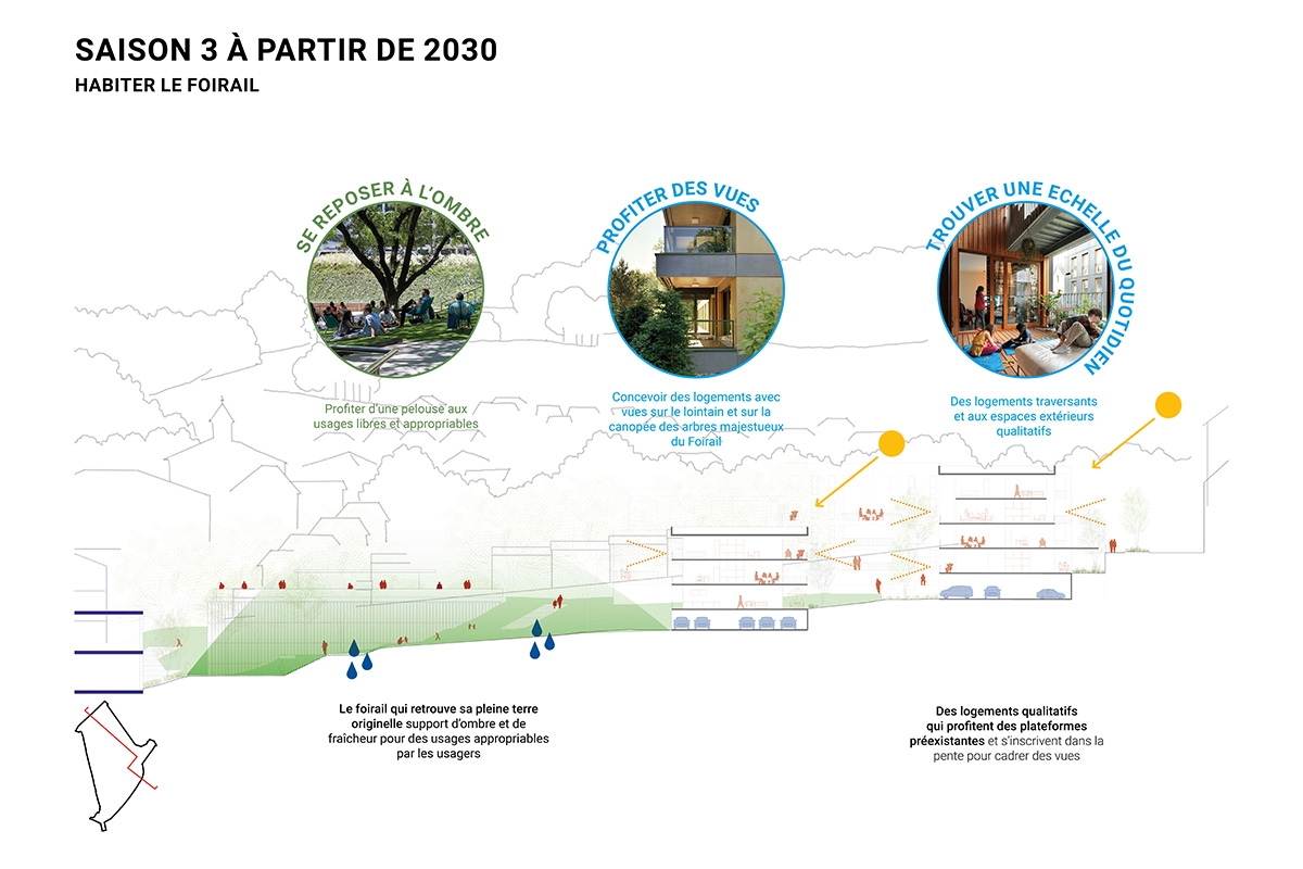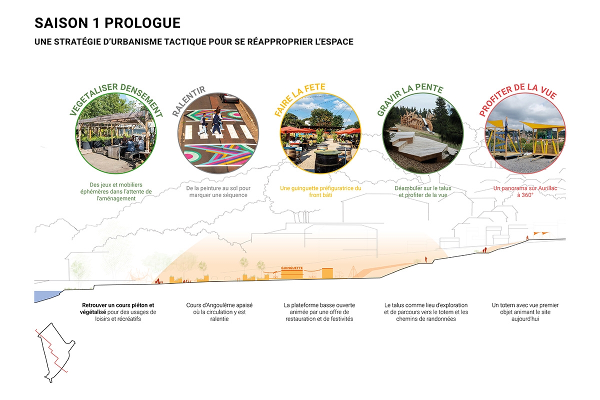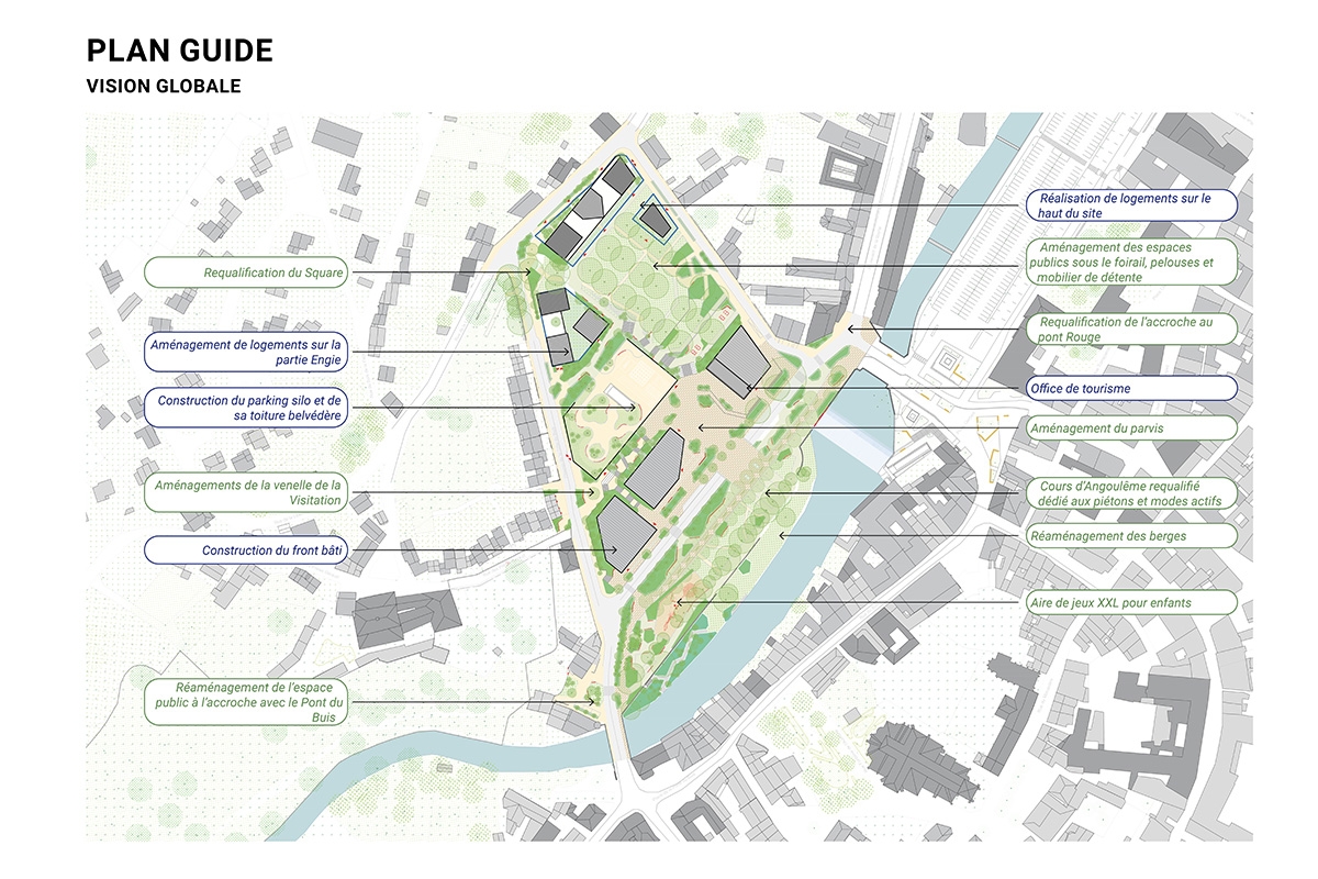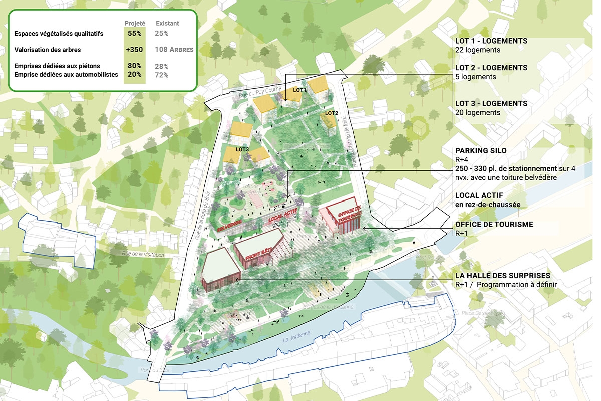 La friche ENGIE et l’ancien Foirail accueillent désormais un nouveau quartier aurillacois qui développe une façade urbaine, face aux maisons médiévales, constituée d'un futur tiers-lieu, d'un office du tourisme et d'un parking silo inscrit dans la pente du site.