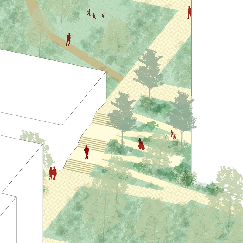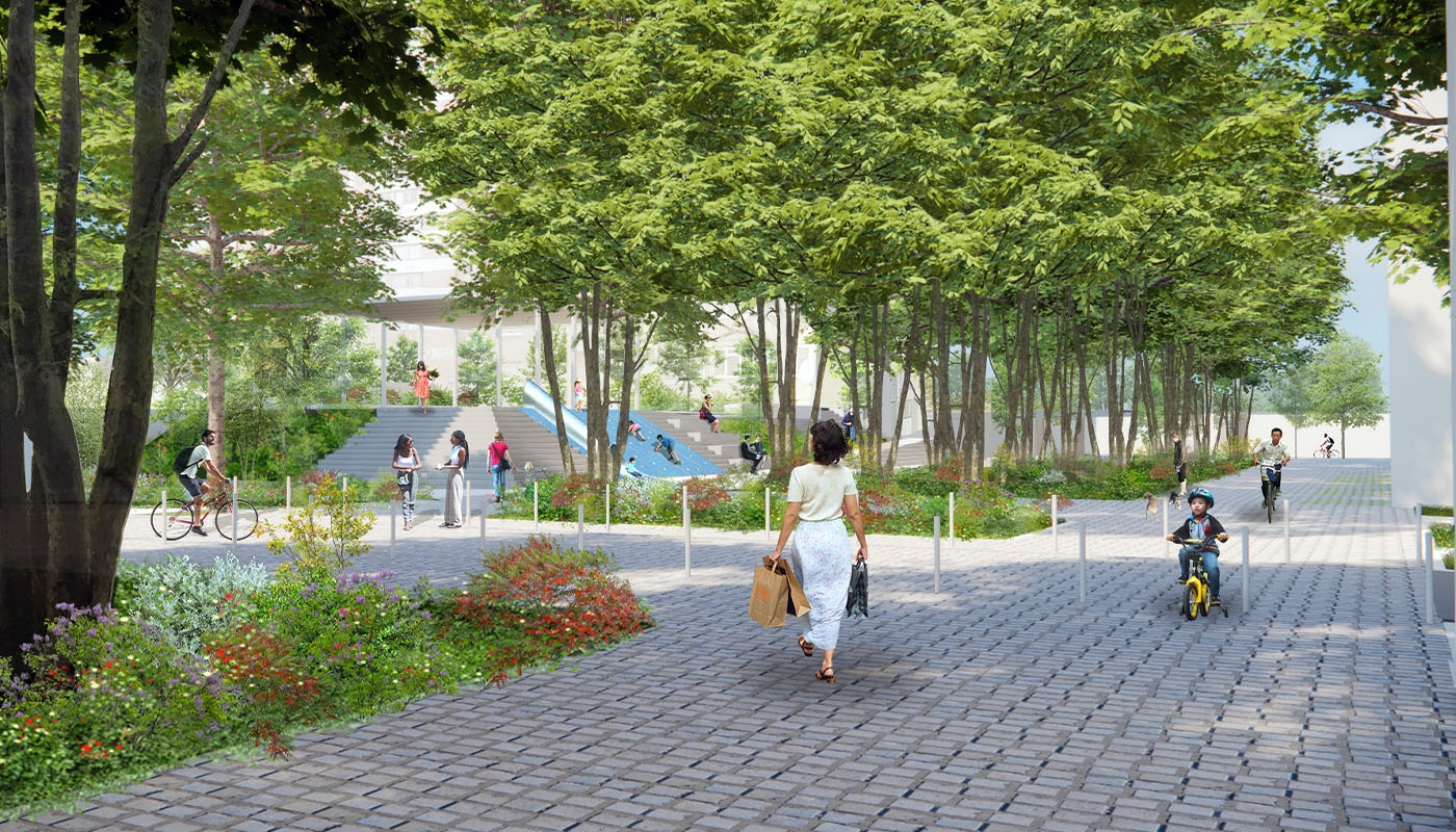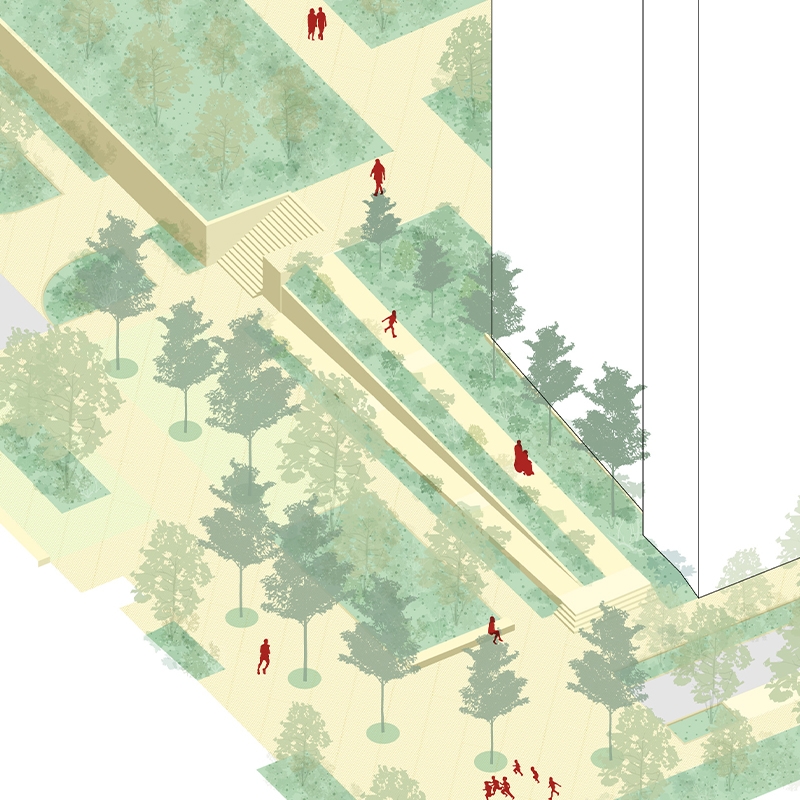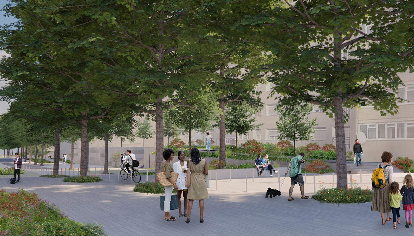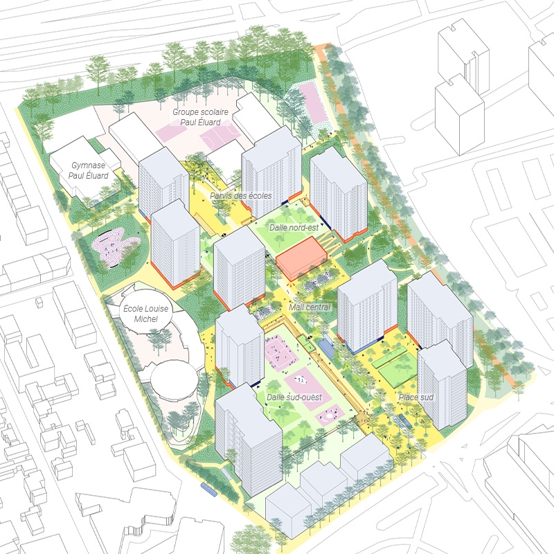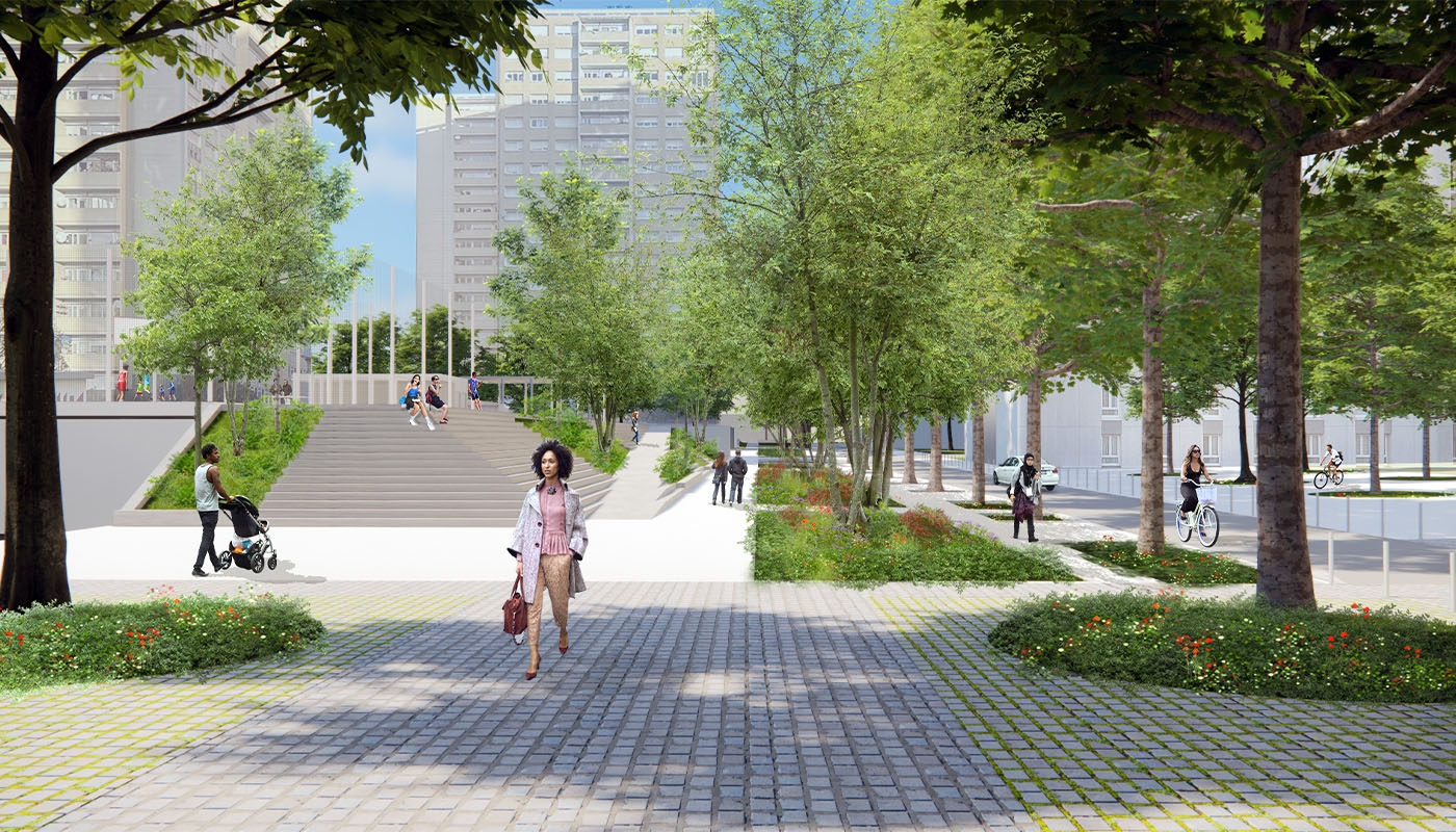 • Retrouver au maximum le sol naturel, pour renforcer la végétalisation du quartier et développer de nouvelles typologies d’espaces publics. Il s’agit aussi de pouvoir réadresser les tours de logement et différents programmes à des espaces majeurs.