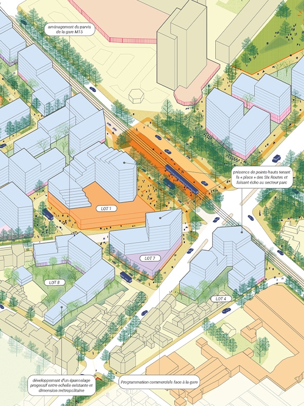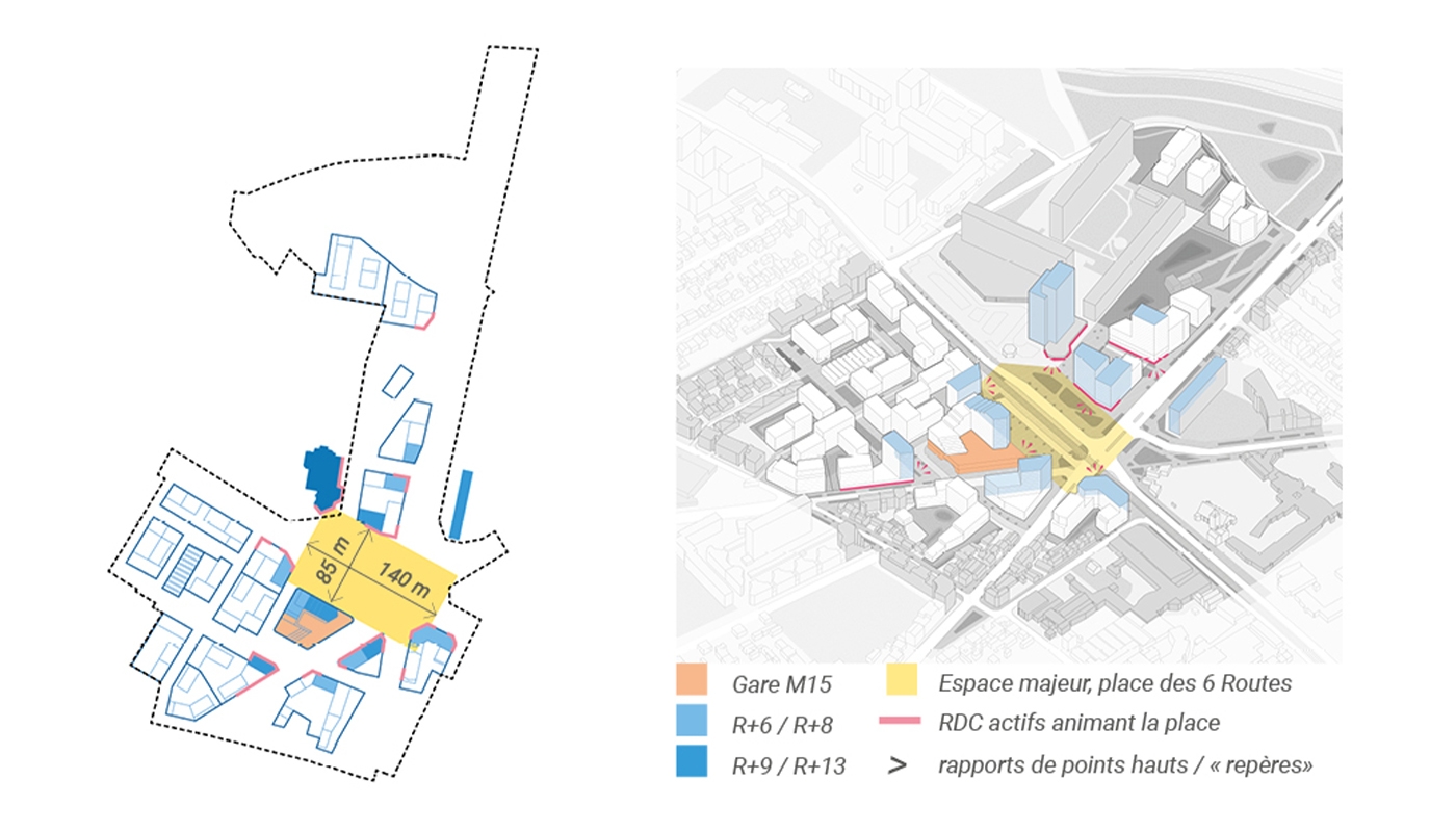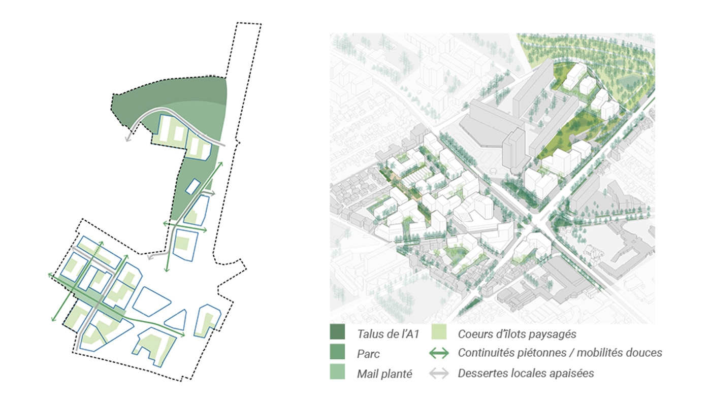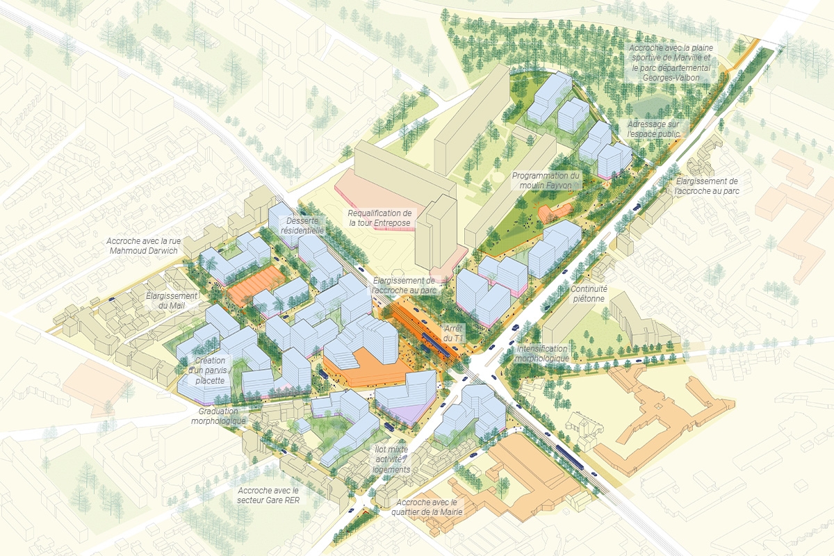 Celui-ci offre l’opportunité de repenser tout le secteur en un véritable quartier de ville durable, une nouvelle centralité faisant le lien avec les différents quartiers de La Courneuve. L’objectif est de repenser l’infrastructure routière et ses espaces associés dans leur globalité, en lien avec la structuration du futur pôle multimodal majeur du Grand Paris. Le quartier s’affirme ainsi comme un nouveau lieu de vie et assume son rôle de nouvelle centralité à la croisée des parcours.
