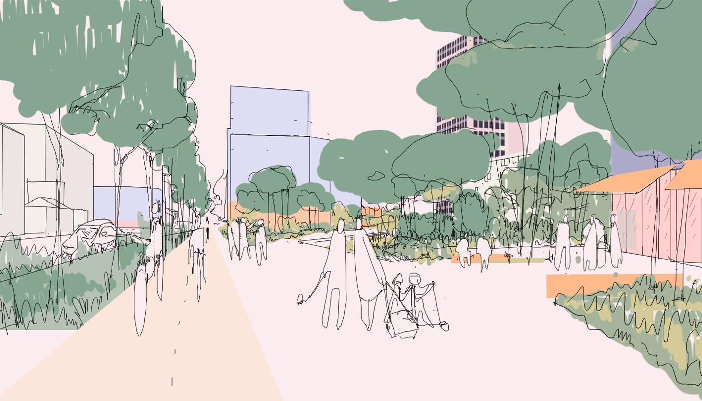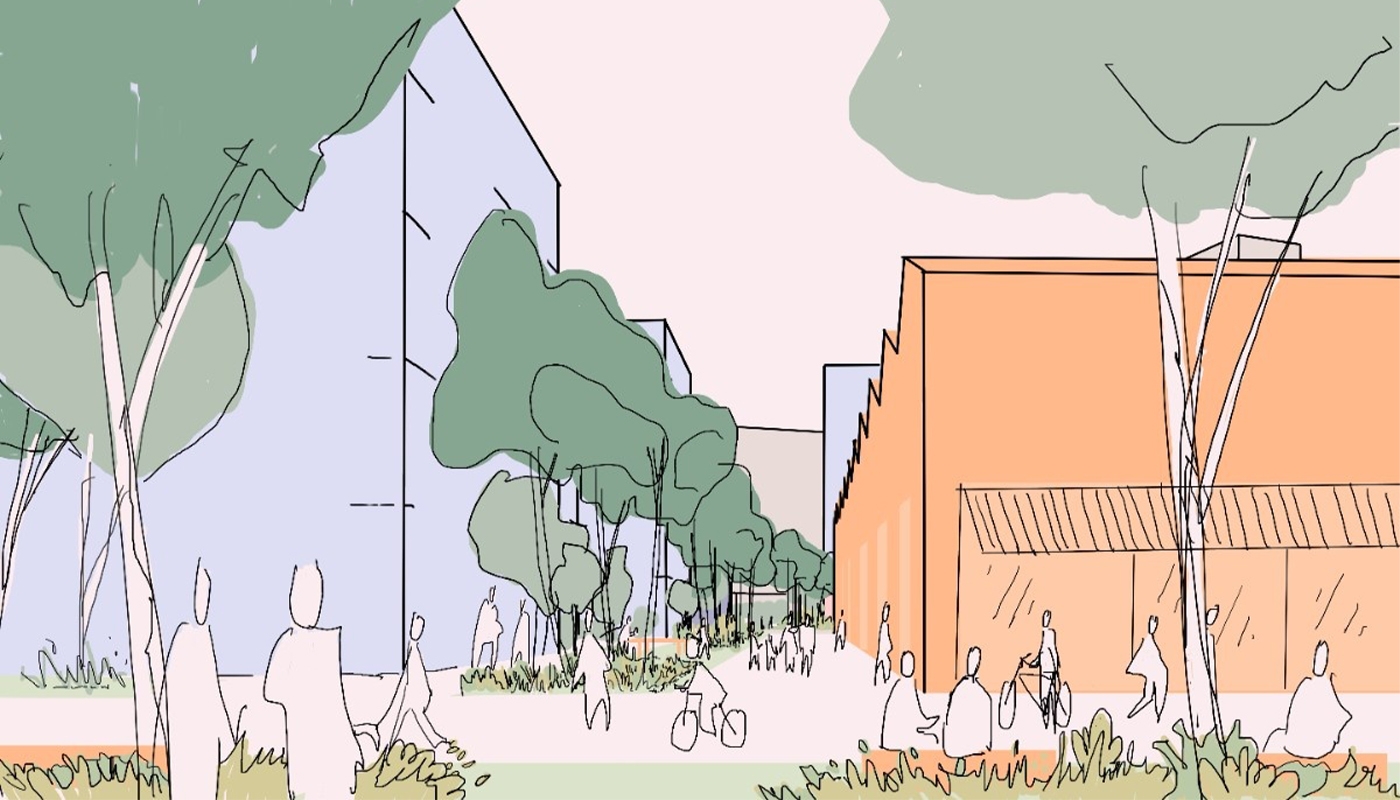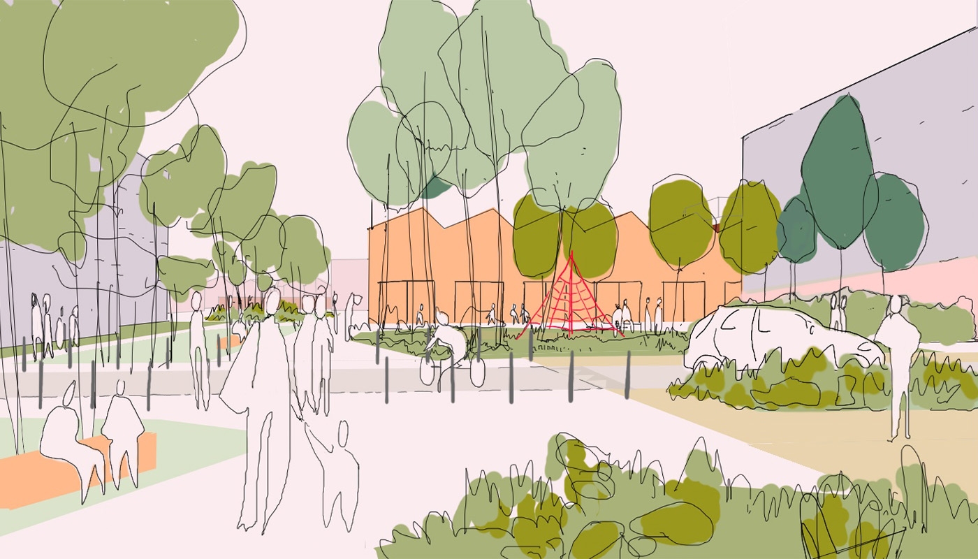 Le projet paysager porte l’ambition de construire un quartier apaisé, accessible et largement planté, privilégiant le confort et la qualité des déplacements piétons.