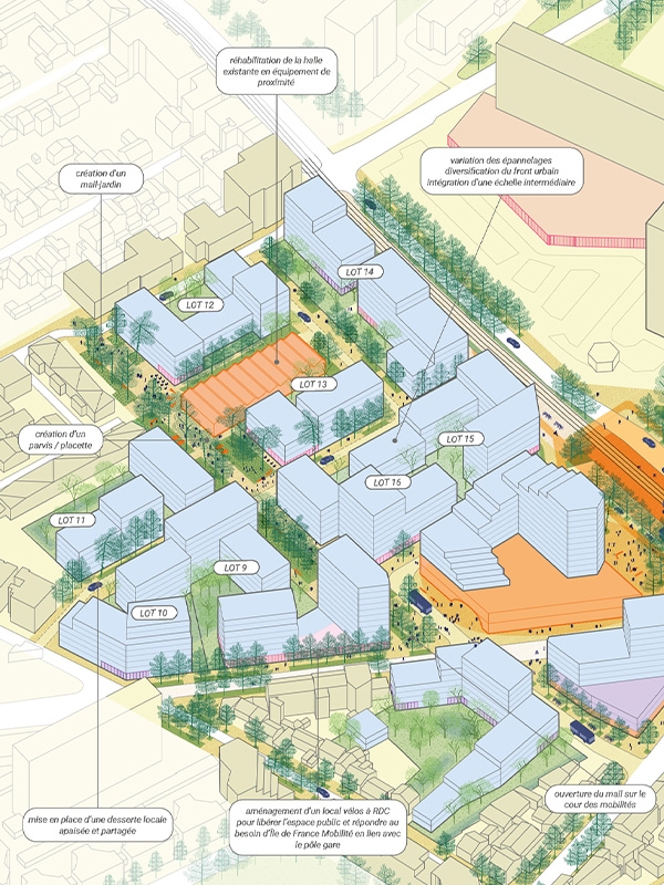 Les formes urbaines proposées offrent des vues dégagées aux futurs logements en évitant les vis-à-vis et en limitant les hauteurs. Elles développent également une diversité des modes d’habiter au sein du quartier, articulant maisons de ville, habitat intermédiaire et logements collectifs.