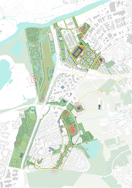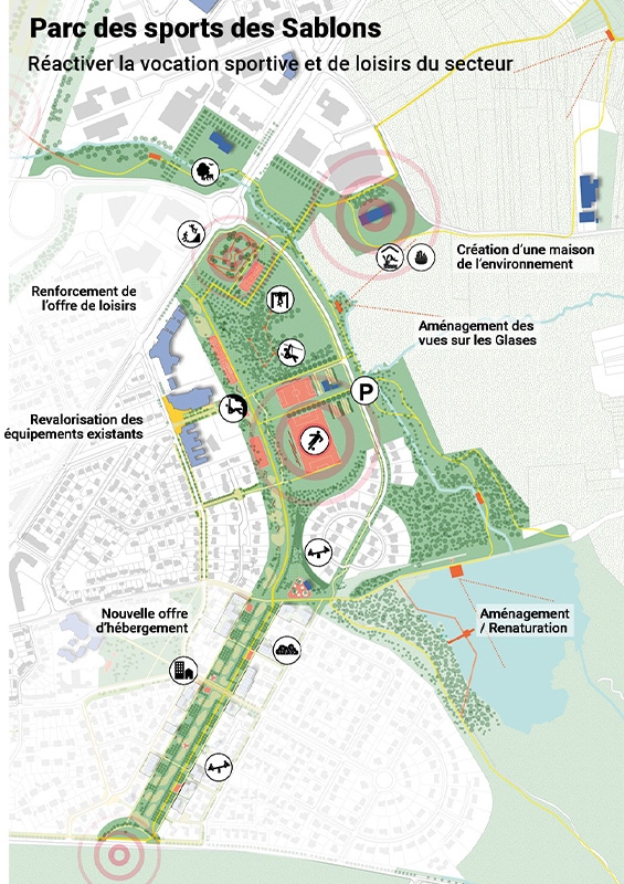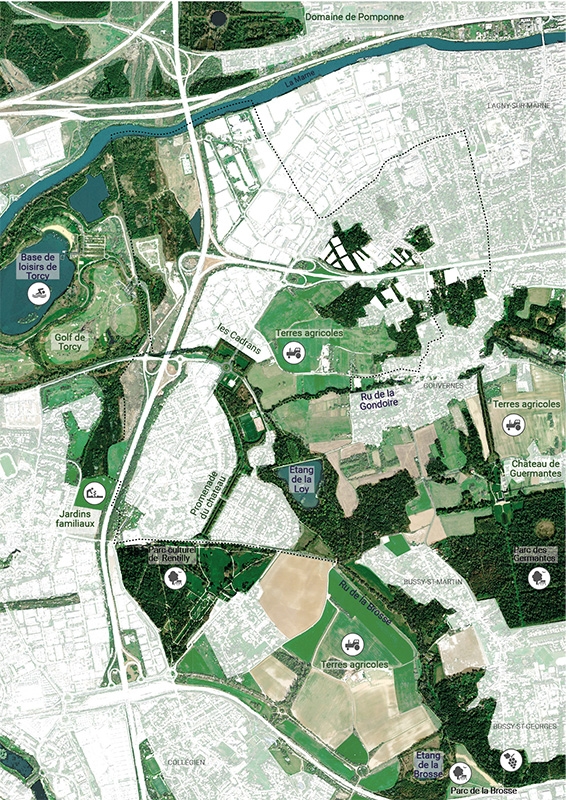 Trois pièces paysagères structurent cette armature: un parc naturel inondable sur les berges de Marne (gestion des crues, zones humides, continuités écologiques), unparc agricole Torcy–Saint-Thibault (pédagogie, circuits courts) et un parc des sports des Sablons (pratiques libres, équipements de proximité).